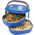 This insulated two tier food container with folding handles allow you to carry like a classic lunch box. The two tiers enable you to keep food separated. The inside layer is stainless steel while the outer layer is plastic. FDA Compliant. BPA free.